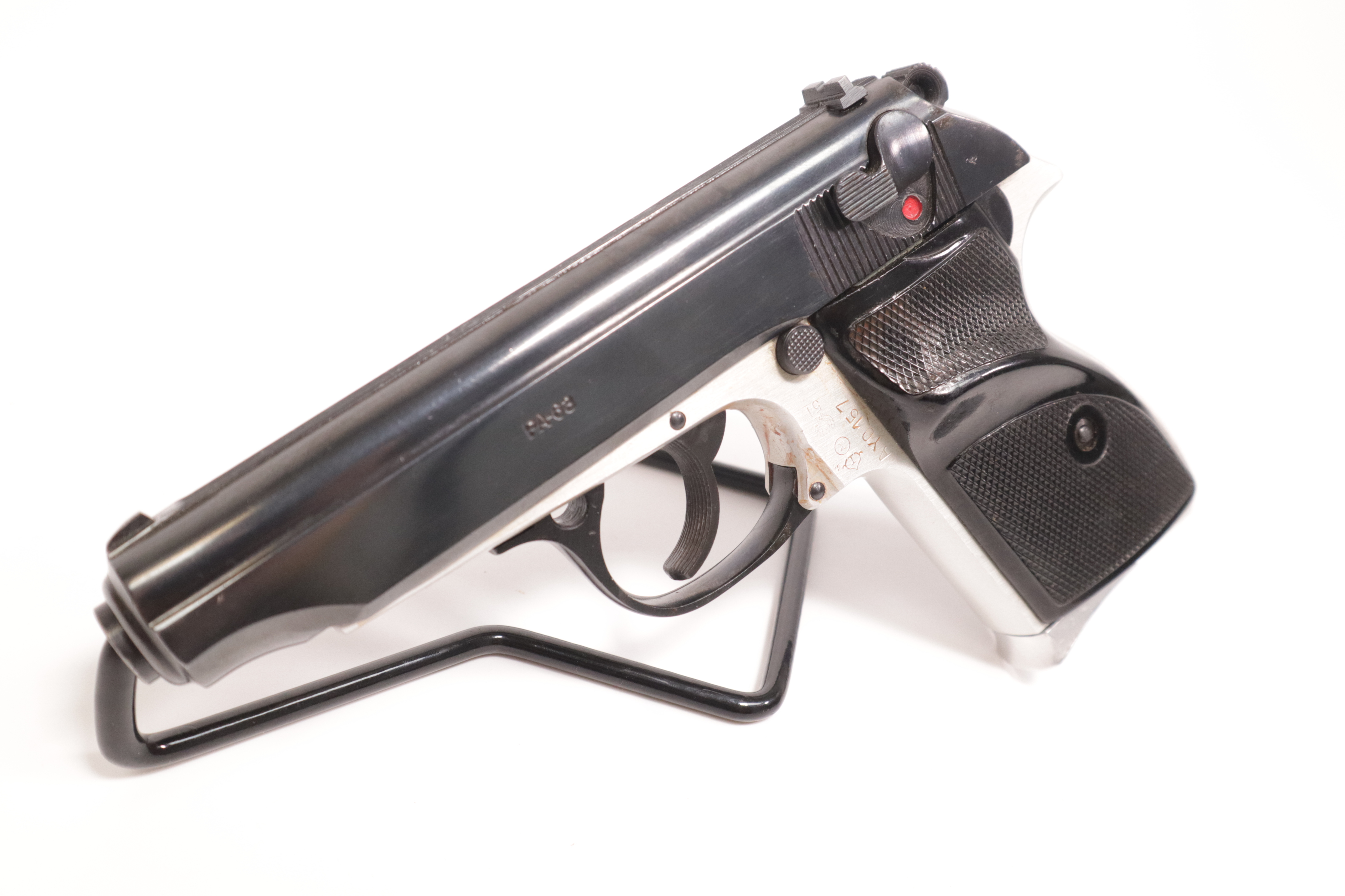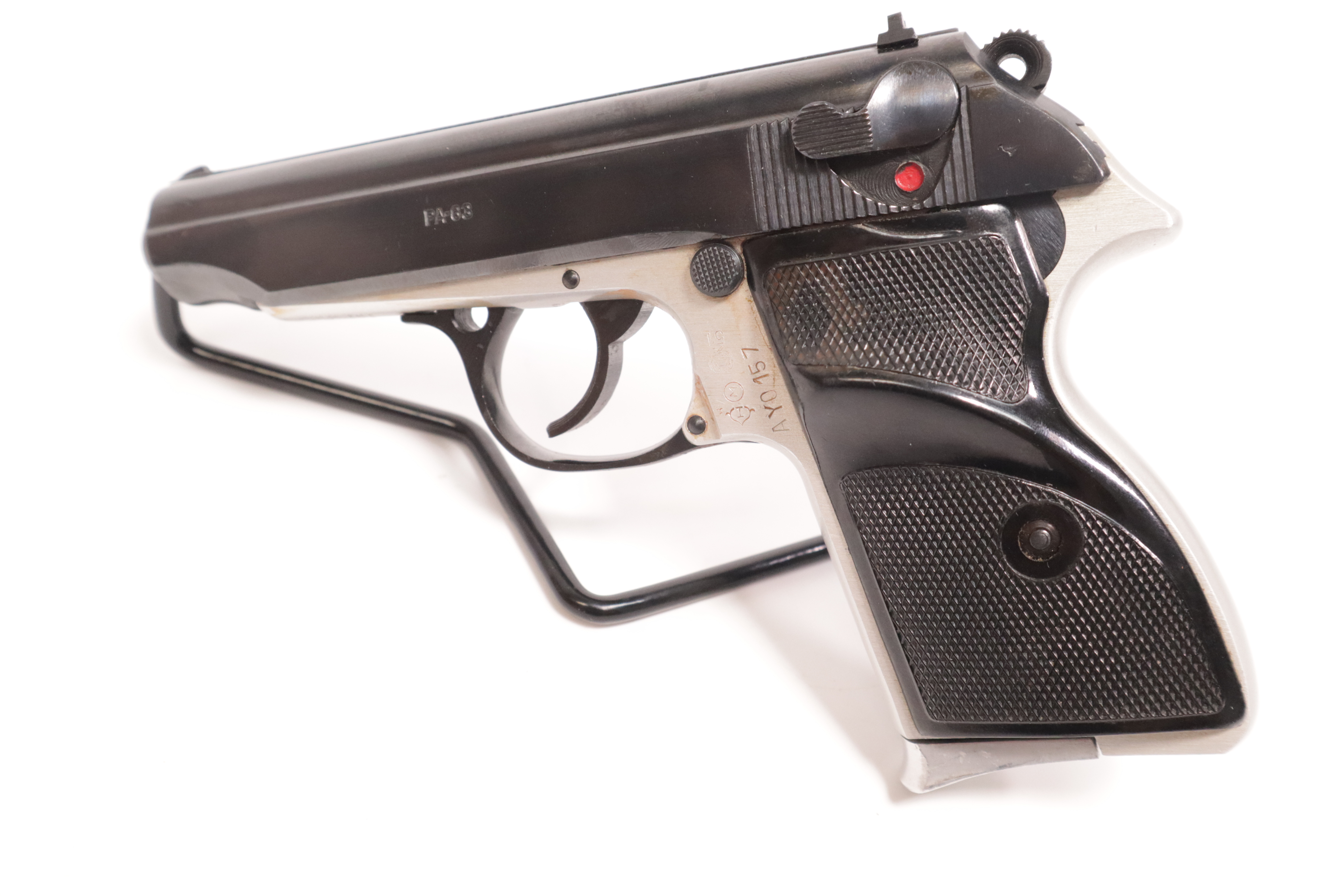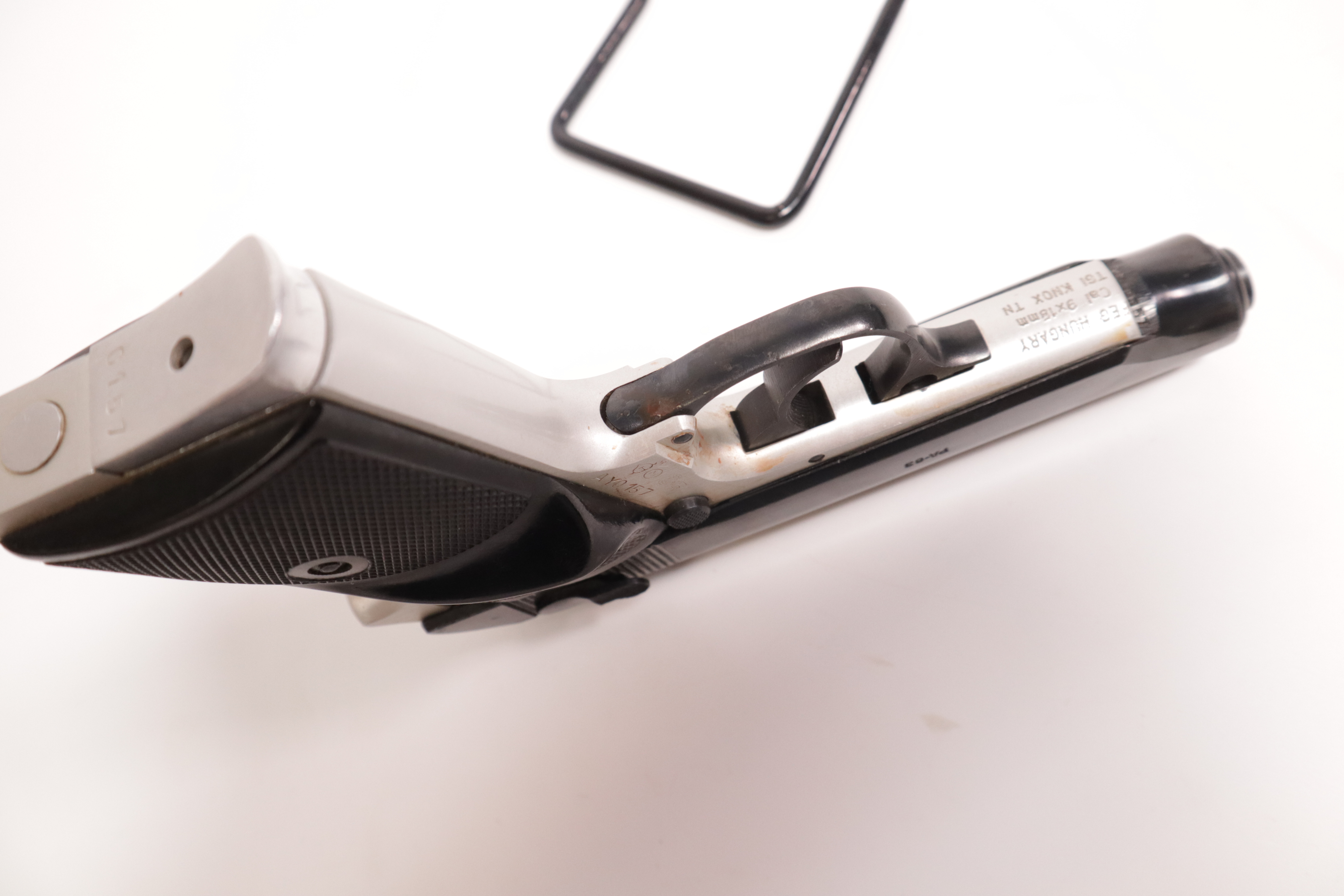 Description: This is a classic Hungarian police and military pistol having been produced from 1963 to 1990. The overall condition is “very good”, showing minor signs of use and handling. There is some dried oil on the frame, which may look like rust in the photos. We have not test fired this pistol, but all fire functions are normal per a physical inspection. This comes with one magazine.